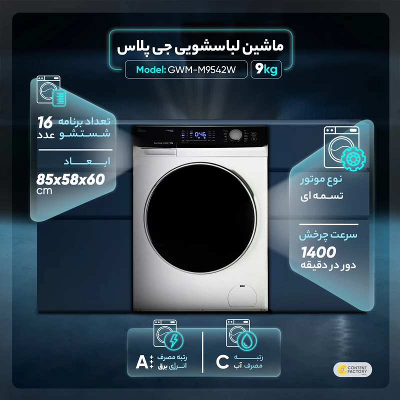 ماشین لباسشویی جی پلاس مدل GWM-M9542W ظرفیت 9 کیلوگرم